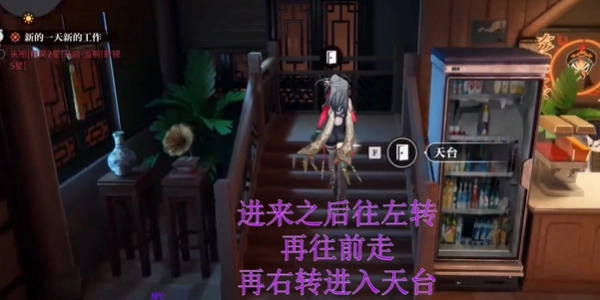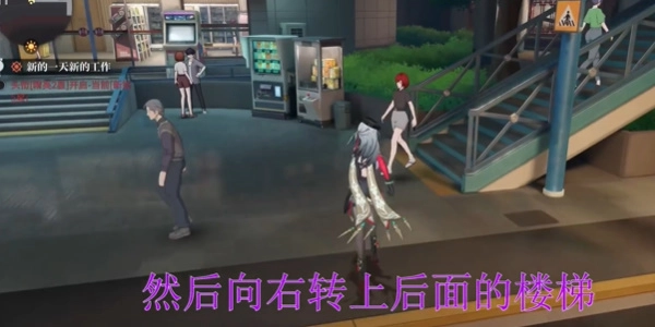 2. 向左行进,抵达天桥后,向右转并踏上楼梯。