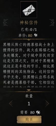 附:下楼梯后,通过左侧楼梯能让黑精商人连续打开两扇门,跑到两个修女所在的铁门后方,他就在那里。其出售的任务道具【神秘信件】,可让火猪旁门洞处的NPC让路。