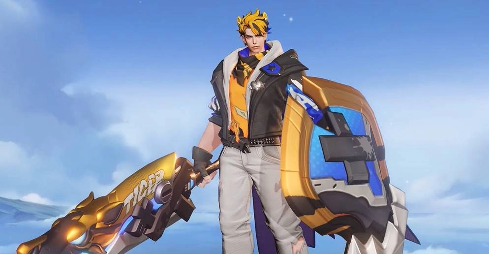 3、在武器设计方面,剑与盾牌上有着虎纹图案,剑柄处的虎爪装饰运用了黄色和蓝色条纹。