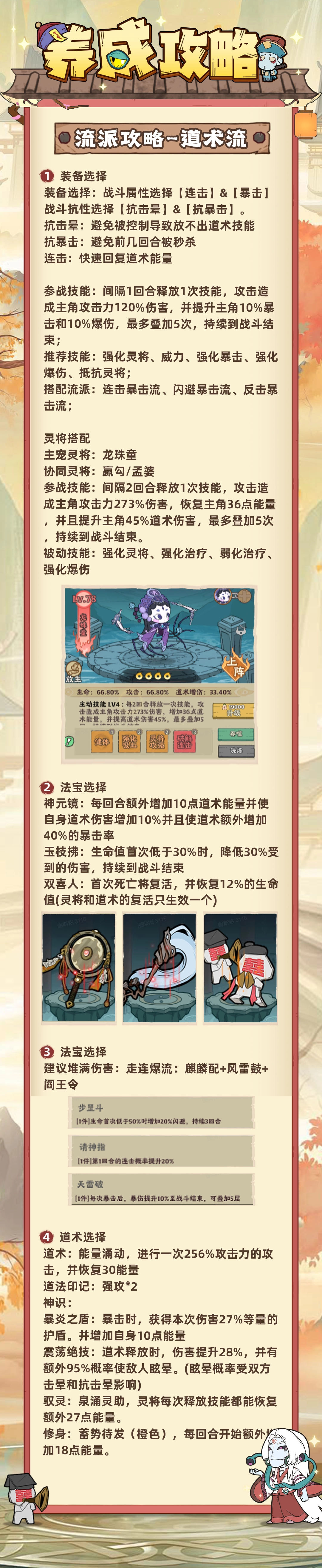 推荐技能:灵将强化、威力提升、暴击强化、爆伤强化、灵将抵抗。