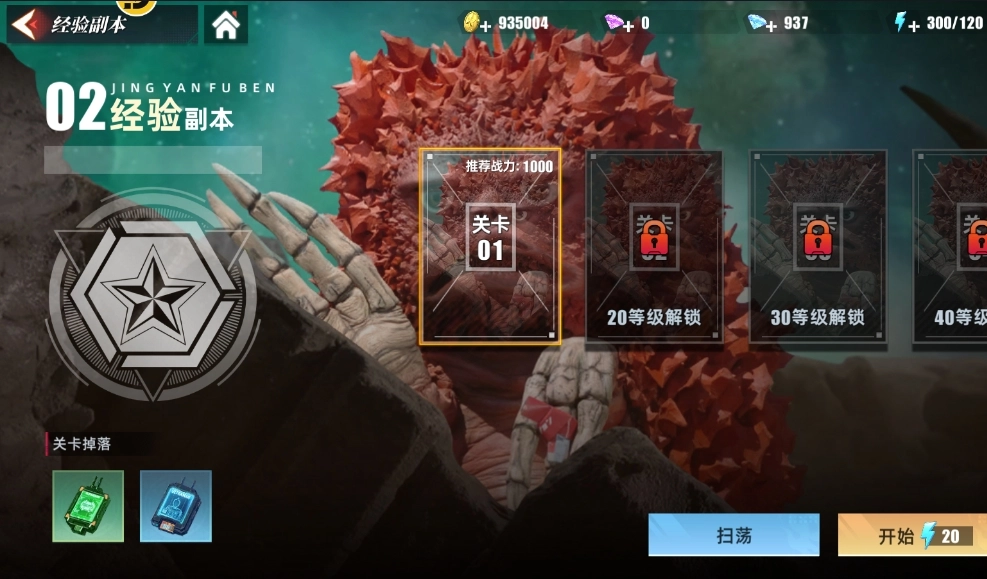 这个经验副本是大家解锁历练后的第二个副本。要进入历练,可以通过主页面左下角操作。此经验副本又名“比格蒙的馈赠”,属于资源类且全天开放。当你点击进入就会发现,它存在等级限制,不同等级能参与的经验副本有所不同,同时还有战力要求。例如新手阶段,大家能解锁的仅有关卡01 ,该关卡推荐战力仅1000,通常十几级就能参与这个副本。后期关卡基本10级就能解锁下一个。