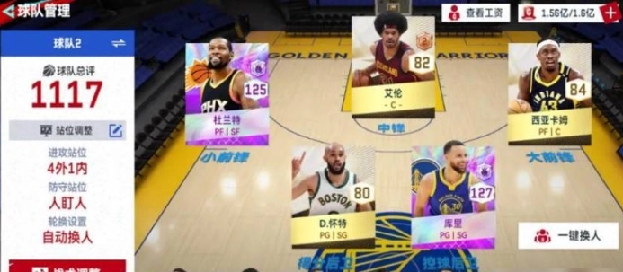 综合考虑上述因素,采用4外1内的站位方式,我们能够挑选能为杜兰特拉开进攻空间的内线球员,同时搭配外线具备强力防守能力的球员,以此实现最佳的组合效果。