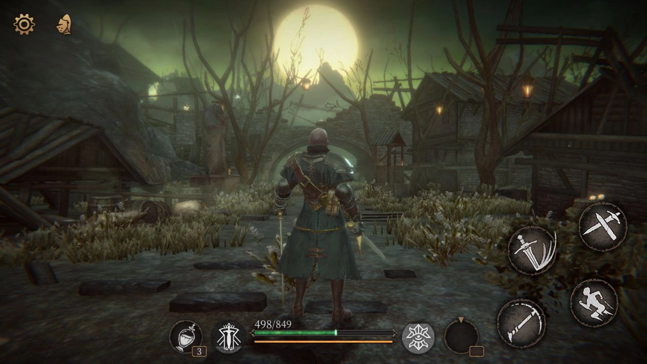 于手机端畅玩动作游戏时,大家最为关注的,无疑是操作手感以及战斗体验。鉴于此游戏属于魂like类型,在战斗设计上借鉴颇多。其角色战斗呈现出慢节奏模式,招式与《黑魂》《怪物猎人》类似,每个招式皆存在前摇与后摇,整体招式风格偏向写实,几乎不见花里胡哨的动作与特效。