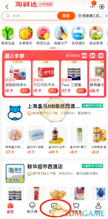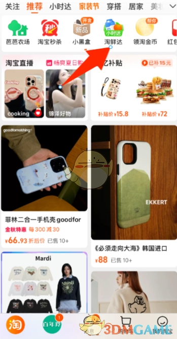 1. 第一步,打开淘宝应用,接着点击界面上方的淘鲜达选项,具体位置可参照下图。