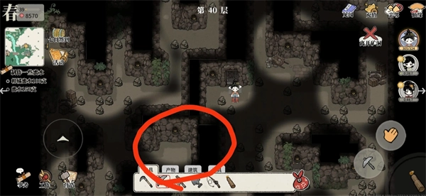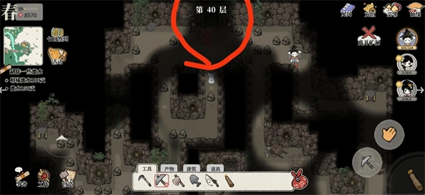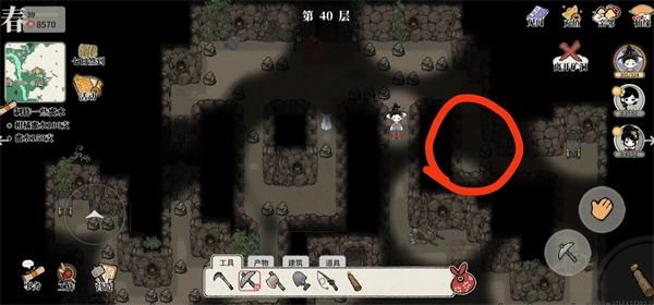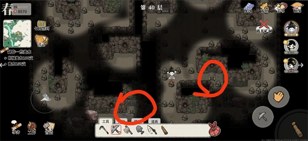 2、矿洞第40层有宝箱,位置在图中所圈之处,总计5个。靠近宝箱后,点击右手边的交互按钮就能开启,开启可获取部分道具。该宝箱的机制和矿洞外地图上的宝箱一致,每天能开启1次,每天零点刷新。
