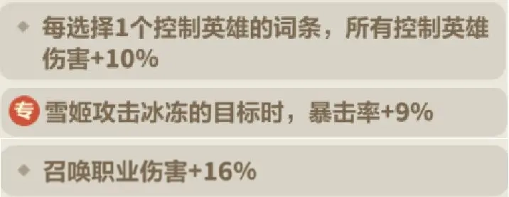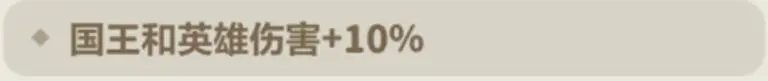 能为国王与英雄提供增伤效果,适用于所有职业,是典型的万金油属性。不过它的增伤力度相对有限,当有更多词条选择空间时,会被针对性更强的专精词条所取代。