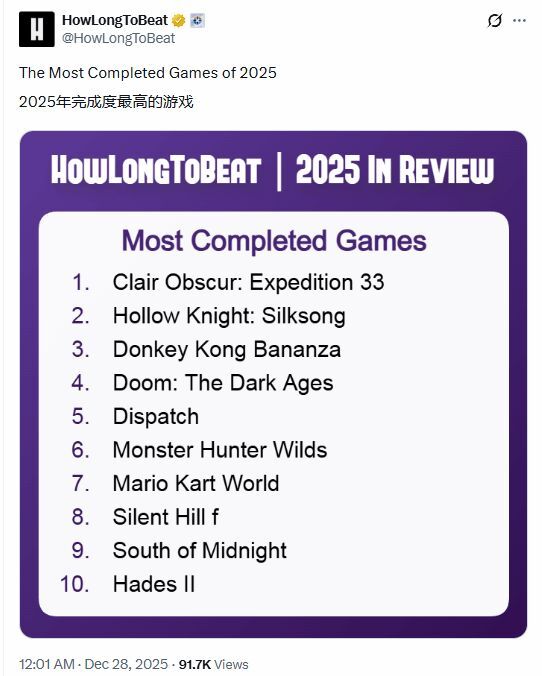 游戏完成度追踪平台HowLongToBeat把《光与影:33号远征队》评定为2025年度玩家完成度最高的游戏。紧随其后的《空洞骑士:丝之歌》《咚奇刚:蕉力全开》等作品,同样是今年备受瞩目的热门游戏。