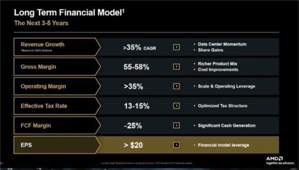 不过GPU业务对于AMD未来三到五年的市场布局而言至关重要,在此次大会上AMD还对外公布了一系列财务方面的目标,具体情况如下: