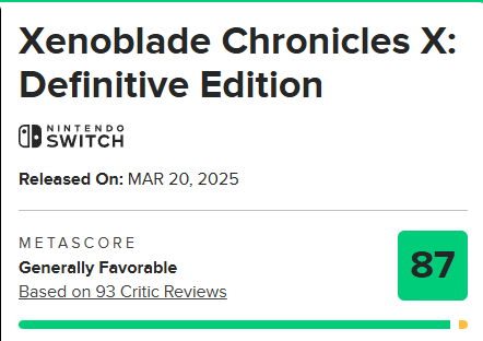 尽管如此,《异度之刃X:终极版》至今尚未推出专属的“Switch 2版”或次世代强化版本。这款游戏最初于2025年3月20日登陆Switch平台,是Monolith Soft 2015年原作的全面强化移植作品,不仅拥有更精良的画面和优化的系统,还新增了补完原作剧情的全新章节,发售后在M站取得了87分的高分评价。