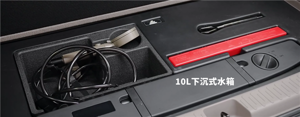 这是额外选装 "野奢户外套装"才有的功能,在后备箱有个下沉式 10L 的小水箱,然后连接车载 220V 电源,1200W 的功率,10 分钟就可以把水加热到 45 度。