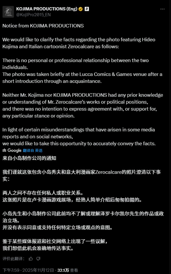 针对该事件,小岛工作室发布声明称,相关照片是在意大利某展会期间,经他人介绍短暂交流时拍摄的。声明明确指出,小岛秀夫与Zerocalcare之间不存在任何私人交情或合作关系,工作室及小岛本人此前对对方的作品内容和政治立场均不知情,发布照片并非出于表达任何政治立场、主张或支持的目的。