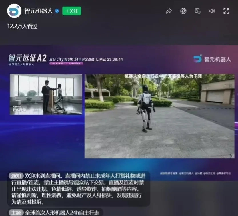 今年8月,智元远征A2人形机器人进行了一场长达24小时的“夏日Citywalk”直播活动。在此次活动中,它不仅经受住了超过35℃的高温考验,还克服了夜间弱光的不利条件,并且全程无需人工遥控,最终成功完成了全球首次全尺寸人形机器人在高温环境下完全自主长时间行走的挑战。
