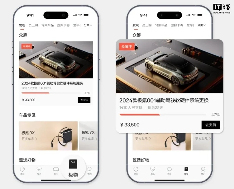 本次众筹按车型分类推进,当活动截止时各车型对应的参与人数达到预设目标,我们就会着手准备该车型软硬件系统的更换事宜。用户可通过极氪App进入极物板块,在首页找到众筹入口,选择对应的众筹项目后点击“去支持”按钮,就能完成参与流程。