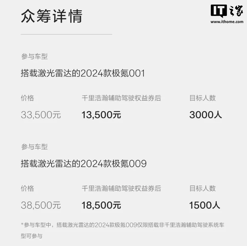 价格上,2024款极氪001若搭载激光雷达,众筹价格为3.35万元;而千里浩瀚辅助驾驶权益在使用券后价格是1.35万元,此次众筹的目标参与人数为3000人。