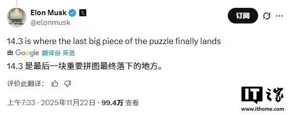 11月23日消息,特斯拉首席执行官埃隆・马斯克(Elon Musk)在公司向用户推送FSD v14.2版本数小时后,便公开透露了下一个重大更新版本v14.3的相关信息。他表示,v14.3版本将成为“最后一块关键拼图最终就位的版本”。