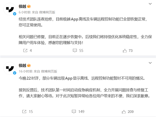 针对这一情况,极越汽车官方作出回应表示,今晚22时左右,有部分车辆出现App显示离线、远程控制功能暂时无法使用的状况。