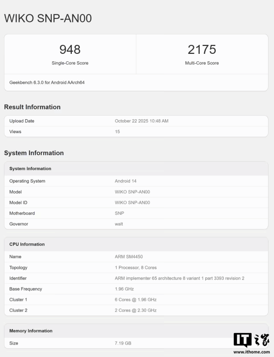 值得留意的是,这款手机已出现在Geekbench数据库中,它的单核跑分为948分,多核跑分为2175分,运行Android 14操作系统,采用SM4450处理器,这表明该手机大概率搭载的是高通骁龙4 Gen 2。