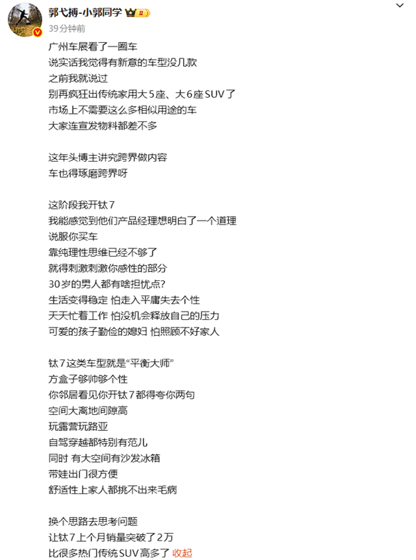 他提到,逛了逛广州车展,没发现太多让人眼前一亮的新车,还提议车企别再扎堆推出传统家用大五座、大六座SUV了——毕竟市场上这类用途相近的车型已经够多了。