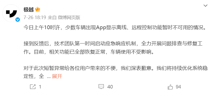 实际上这并非极越汽车首次遇到类似问题。今年7月,曾有部分车主反映极越车辆配套的App出现显示离线、远程控制功能异常的情况,甚至蓝牙钥匙也无法正常使用。当时极越CEO夏一平曾发文称,团队紧急进行修复工作后,相关车辆的功能已恢复正常。