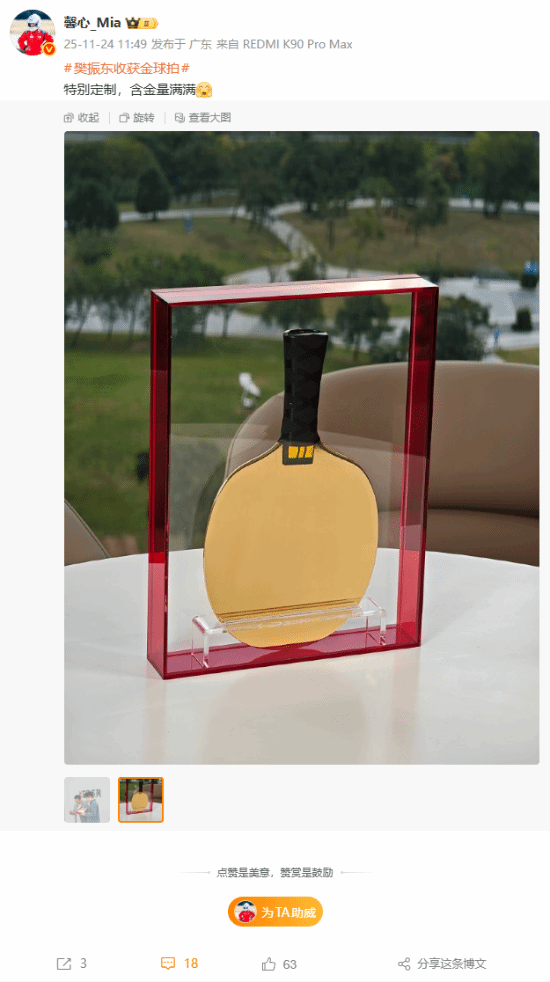 值得一提的是,小米还专门为“超级金满贯”获得者樊振东准备了一份定制礼物——黄金球拍。