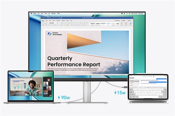 另外,用户可以开启iKeyboard操控,感受更全面的“苹果生态”交互体验;借助FocuSync功能,显示器能同步Mac的专注模式设置,并且支持Siri语音唤醒。内置的传感器还能根据环境光线自动调整屏幕亮度。