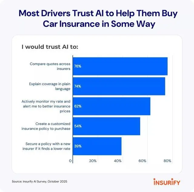 AI 尤其在比价方面广受欢迎:76% 的受访者表示,他们曾使用 AI 来比较不同保险公司的报价。