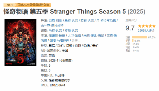 《怪奇物语》最终季的前四集已经上线,当前在豆瓣平台的评分达到了9.7分的高分。