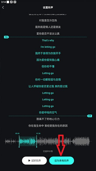 进入设置铃声页面后,挑选你想要的铃声片段,接着点击页面底部的【设为来电铃声】按钮就完成了。
