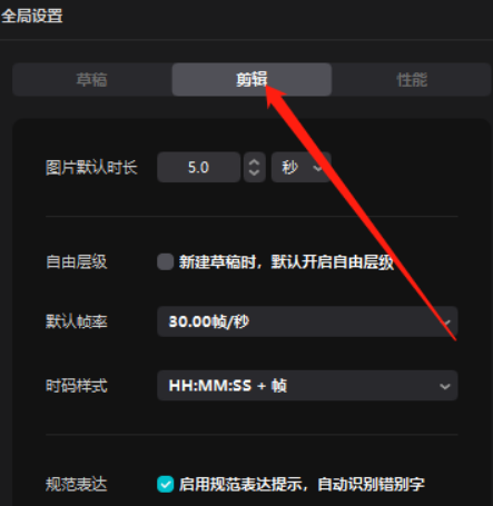 打开全民设置后,在弹出的窗口界面里,点击上方的“剪辑”选项卡即可。
