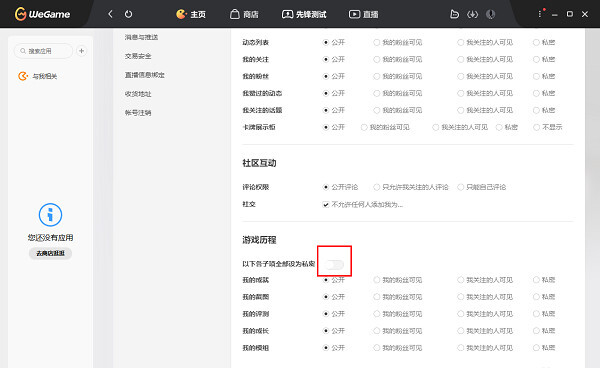 4、接着在右侧的“游戏历程”板块里找到“以下各子项全部设为私密”这一选项,把它右边对应的开关按钮开启。