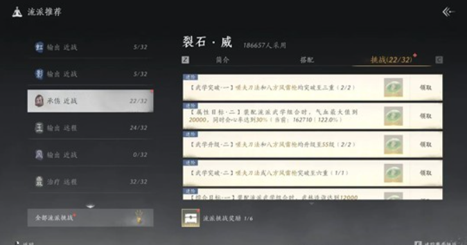 核心思路其实很简单:先把自身当前使用的武学重置,接着按照虹虹、霖霖、九九这类特定的武学组合顺序,逐个将其他流派的武学强化到100级。等这些武学都满级后,你会发现P2区域的流派挑战会自动完成大约20个——毕竟里面不少任务都是要求武学造诣达标或者属性达到指定数值,而满级武学的属性基本能轻松满足这些条件,所以完成20个左右的任务是很自然的事。