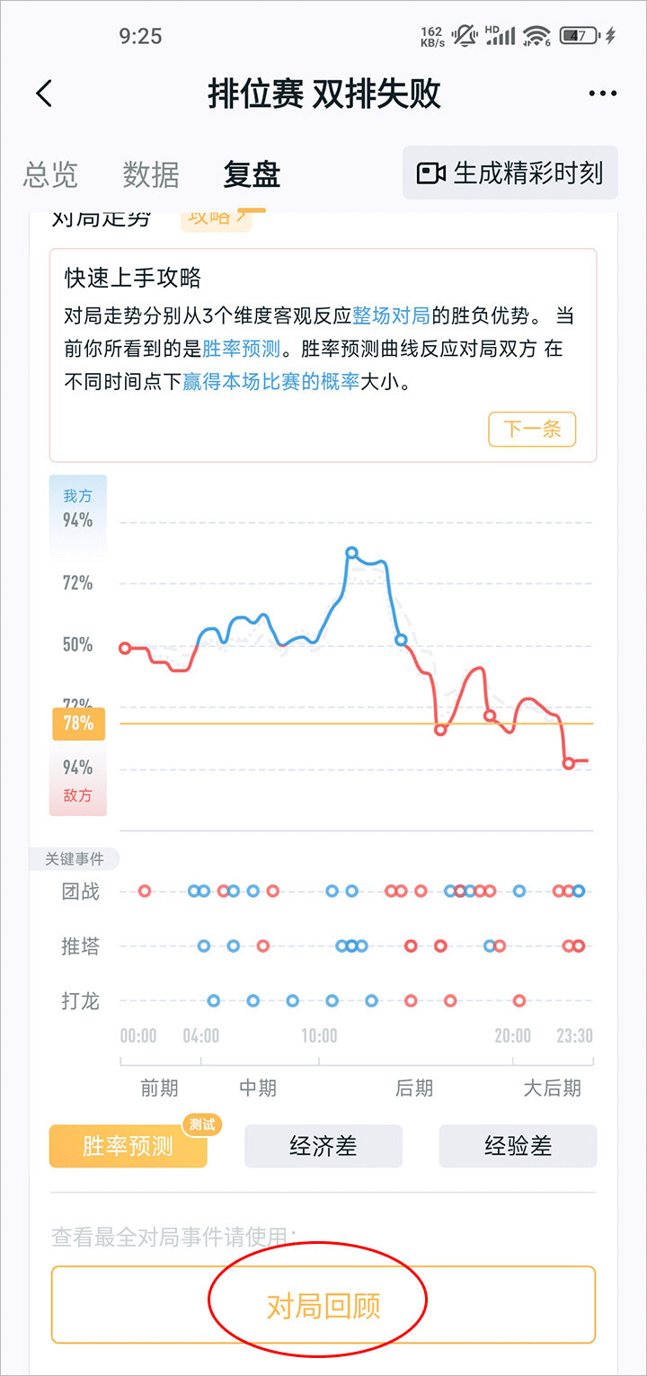 进入该对局详情页面后,点击“复盘”按钮即可。