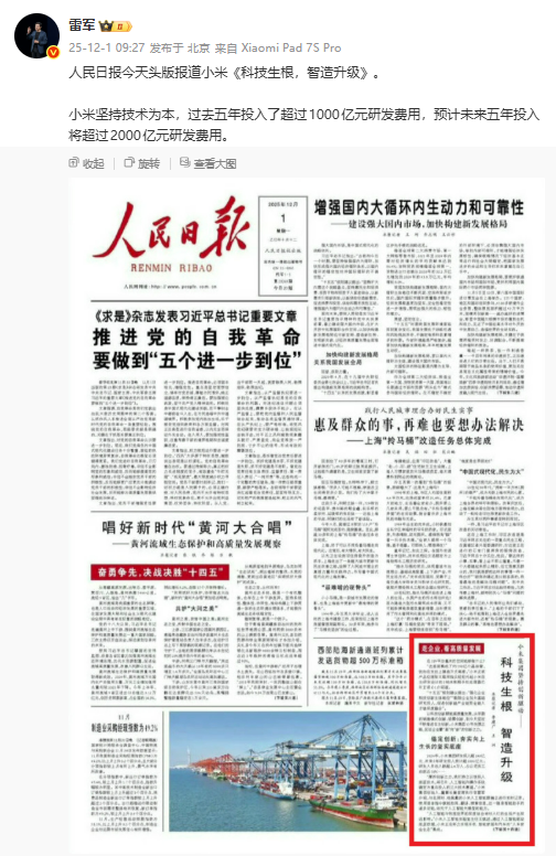 《科技生根,智造升级》这篇聚焦小米造车创新实践的报道,着重介绍了其超级电机、智能座舱等核心技术优势,并将小米誉为“科技企业跨界造车的典型代表”。值得注意的是,官媒头版的露出绝非偶然,这无疑是为小米的造车征程盖上了一枚国家队层面的认可印章。