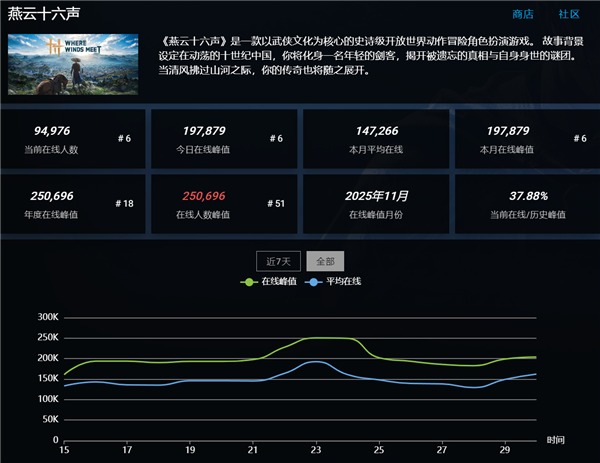 《燕云十六声》在海外走红的关键原因,在于其品质远超玩家对免费游戏的预期——这样的画质放到常规游戏里本可标上不错的定价,可它却采用免费模式,以至于不少国外玩家担心网易运营出问题,纷纷充值皮肤来支持游戏。此外,游戏的场景设计也让玩家沉浸其中,神秘的古侠风格加上丰富剧情,让很多首次接触中国厂商武侠游戏的海外玩家眼前一亮。截至目前,游戏在Steam平台的最高在线人数已达25万,由于国内玩家主要通过网易渠道体验,Steam的数据基本反映了海外玩家的热度,这还没计入主机端的玩家数量。