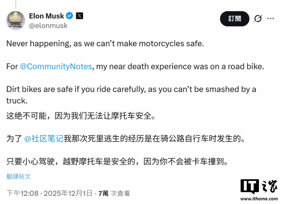 当时他认为,电动越野摩托之所以很酷是因为,开这些车的人不会在有大量 Class 8 货车(IT之家注:重卡,定义为 15 吨以上)的道路上行驶,并解释道:“我们不会做公路摩托车,太危险了。我 17 岁时曾被卡车撞到,差点死掉”。