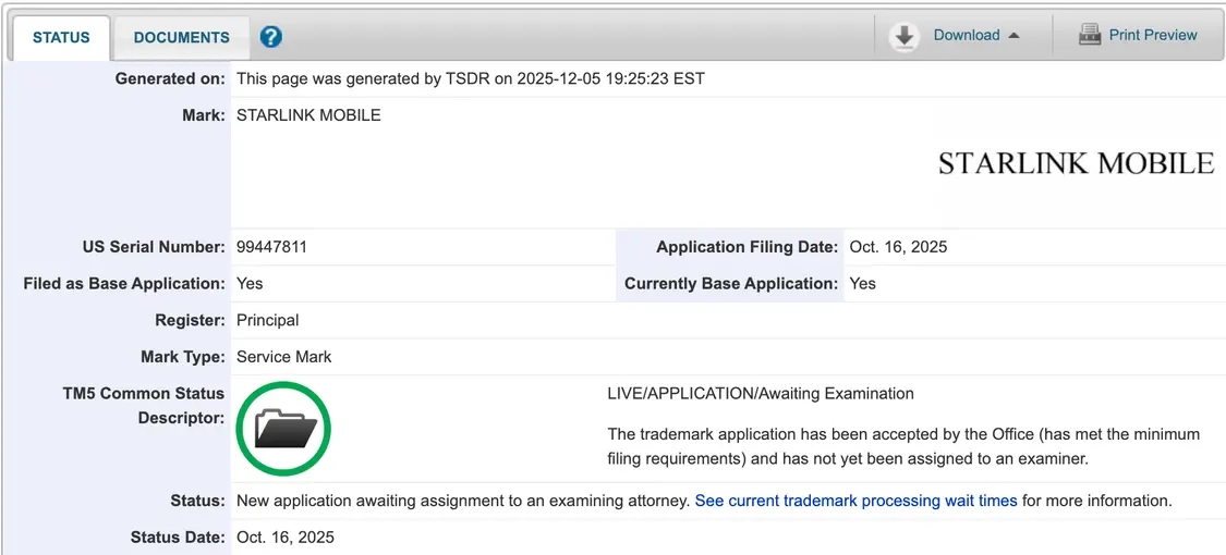 根据美国专利商标局网站的公开信息,SpaceX已于今年10月16日提交了此项商标申请,目前该申请正处于等待分配审查员的阶段。此次申请的商标涵盖通信服务领域,具体包括个人蜂窝服务,以及文本、语音和音频的双向传输服务。