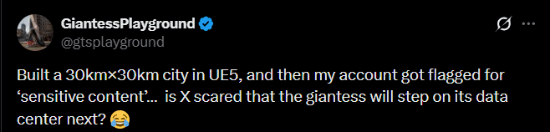 游戏官方晒出了收到推特提醒的截图,还吐槽说:“我用UE5搭建了一座30km×30km的城市,账号却被标成‘敏感内容’。难道推特是怕这位巨人少女一脚踩坏他们的数据中心?”