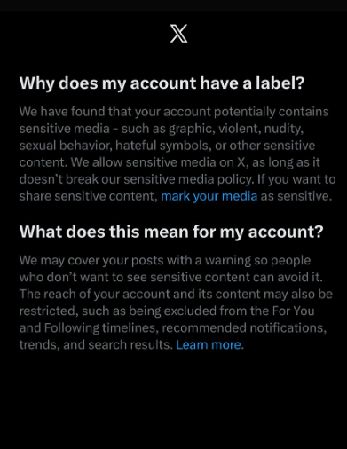 截图显示,推特方面表示,检测到《GIANTESS PLAYGROUND》的账号或许存在敏感媒体内容,像暴力、裸露或是其他敏感信息。平台虽允许发布这类内容,但需遵循其敏感媒体政策。若你打算分享敏感内容,需将相关媒体标记为敏感。一旦标记,你的账号及内容的传播可能会受到限制,具体包括但不限于:不会出现在“为你推荐”或“关注”时间线里;不会被用于推荐通知、热门趋势以及搜索结果中。