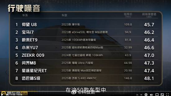 在行驶噪音测试环节,小米YU7的表现依旧十分出色:前排噪音值为46.6dBA,在榜单中排名第4,仅落后于仰望U8(45.7dBA)、宝马i7(46.2dBA)和蔚来ET9(46.4dBA),并且超过了迈巴赫S级等豪华车型。