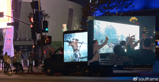 走到街上时,主播毒角SHOW给了我一个意外的惊喜——他租了一辆带有LED屏幕的大卡车,在会场外缓缓巡游,循环播放着我们的视频。震耳的音响和醒目的画面吸引了不少刚结束观展的海外玩家与主播停下脚步,很快,卡车前聚集起一群中国同行,大家齐声喊着“牛X”,连旁边的外国友人也跟着一起喊“牛X”!那辆卡车就像一个临时的聚会点,又好似一艘在人海中航行的船。