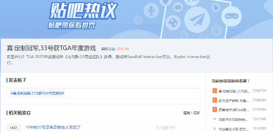 今年TGA奖项结果已公布,《光与影:33号远征队》不仅斩获TGA的9个奖项,更将分量最重的年度最佳游戏收入囊中!“真·定制冠军,33号获TGA年度游戏”的话题很快冲上贴吧热议榜首位,众多吧友都在讨论这款作品获奖的相关事宜。