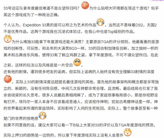 也有玩家认为,《光与影》斩获年度最佳是实至名归。当下对《光与影》的批评更多是舆论跟风所致,颇有些“政治正确”的意味。这款作品的剧情深度实则远超其他游戏,让人回味无穷,其中还有不少值得深入探讨的话题。
