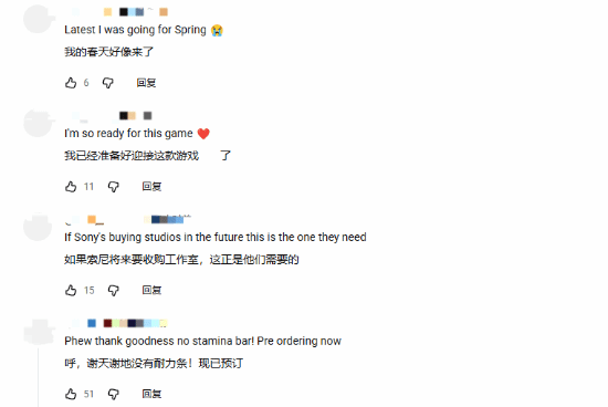 油管上有网友针对此事发文称:“战斗动作干净利落,太酷了。”“若论比战斗更出色的,那一定是音乐。”“我的春天已经到来,完全迫不及待了。”由此能看出,在新宣传片发布后,众多外国玩家对《影之刃零》抱有极高的热情。