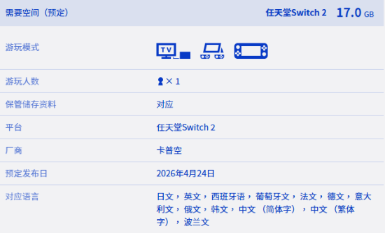 商店页面显示,这款游戏的容量大小为17G。和其他平台相同,它将于2026年4月24日推出。