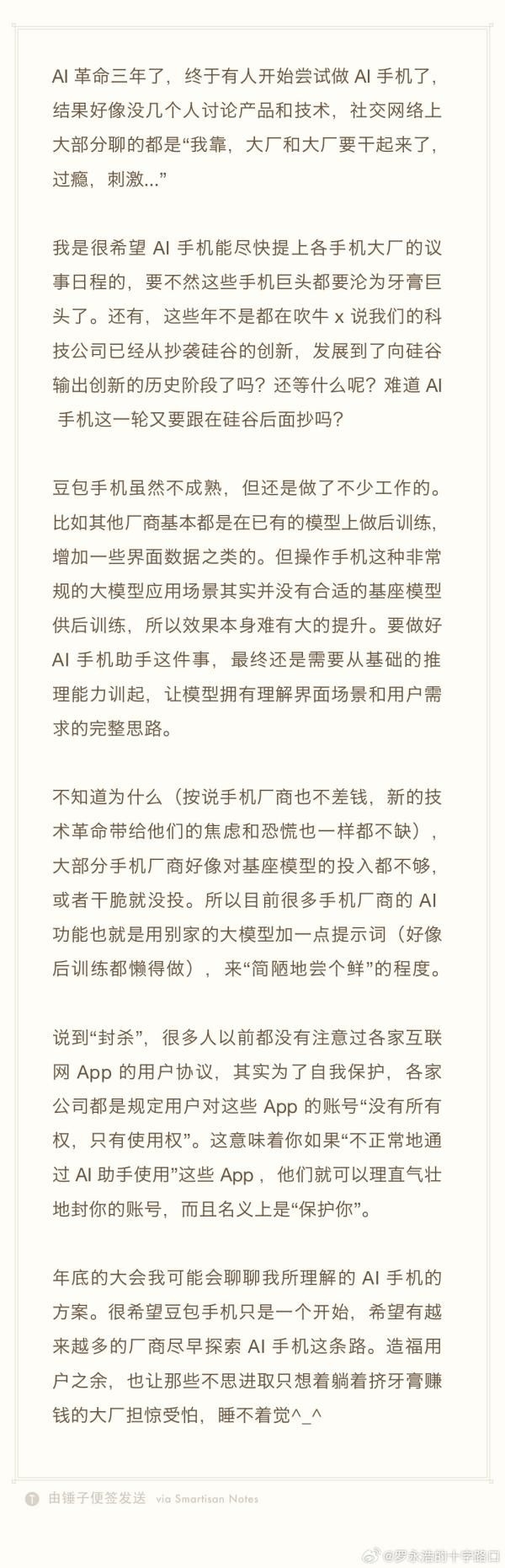 他表示,虽说AI革命已迈入第三个年头,但真正着手打造AI手机的厂商依旧屈指可数,公众的讨论重心也大多放在“大厂互撕”的戏剧化场景上,而非产品本身的技术革新。