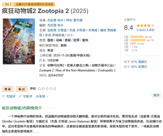 《疯狂动物城2》官宣全球票房已突破10亿美元,影片上映仅17天,便创下好莱坞动画电影及PG级电影中最快达成10亿票房的纪录。