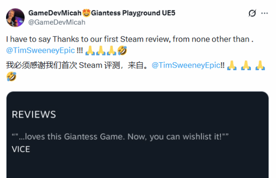 此前,EPIC的CEO TIM Sweeney曾亲自体验并转发了这款游戏,向众多粉丝推荐了这款以“性感大脚”为题材的作品;外媒VICE在评测游戏开发阶段的版本时也提到,游戏画面呈现效果十分出色,破坏效果表现极佳,并且女巨人这一设定也相当有趣。