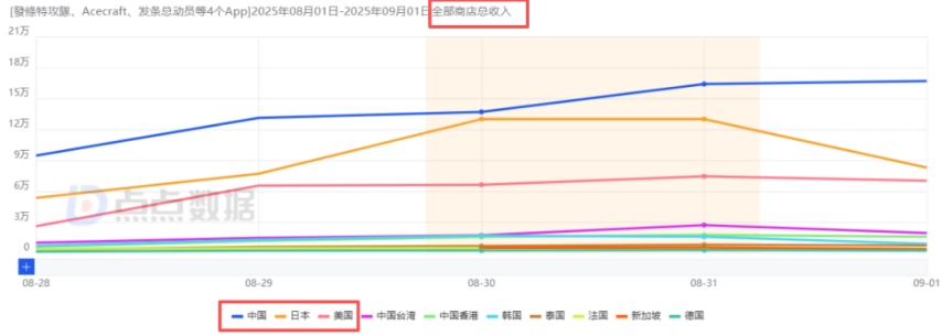 回到8月28日的全球公测,这款游戏登陆了170多个国家及地区,提前一天开启预下载,当天取得25.4万的iOS日下载量(因数据延迟,统计未包含国内安卓端与海外谷歌端,下同),公测首日数据提升到44.5万以上,游戏还登上88个区域市场的iOS游戏畅销榜TOP1(其中中国和**排名第1、美国第3、中国**第4、韩国第7),之后它的日下载量持续增长,截至当前(8月31日)大约在50.2万上下。