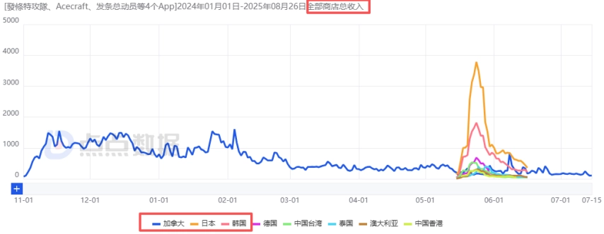 直到今年5月中旬,这款游戏再次扩大测试范围,登陆了日本、韩国、中国香港以及东南亚的部分市场。当时,游戏的日下载量峰值大约在3万左右,日流水峰值则在6万元上下。不过,大概两周之后,这次测试的数据便基本回落至常规水平。值得一提的是,在游戏公测前的国外小规模测试阶段,其累计下载量约为46.5万(其中加拿大、泰国、韩国位居前三),累计流水达到180万(加拿大、韩国同样位列前三),但这款游戏似乎并未在美国市场进行过测试。