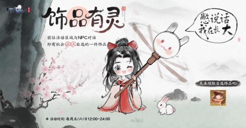 9月12日到9月14日,每天中午12点到午夜12点,“饰品有灵”限时活动开启啦!大家可以去活动页面的【饰品有灵】板块领取普赠的饰品自选礼盒。另外,在活动限定区域里找到活动接引人,和他对话并挑选饰品,就有机会触发饰品放大效果——竹翼腾转、狮醒东方,看这些小巧的饰品如何瞬间变大,一秒抓住所有人的目光!